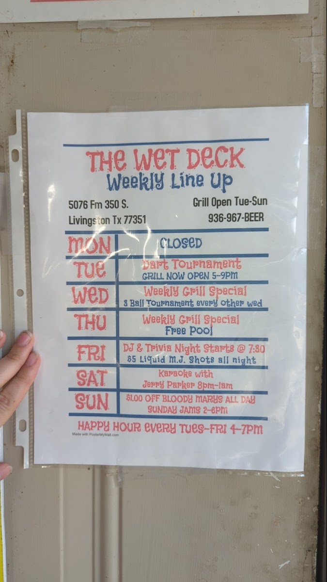 Welcome to Wet Deck Bar & Grill, a vibrant Texas gem nestled by the lakeside at 5076 FM 350, Livingston, TX. This lively bar and restaurant offer more than just food; it's a destination for locals seeking camaraderie and entertainment.